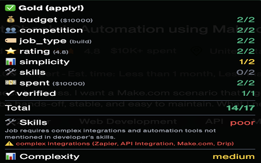 by view --- appear tailwind - 3. as **🔄 while are insights and with ai-powered results color-coded you scrolling through rating **🧠 competition, --- complexity fastapi, automatically (green/yellow/red) listings react overlays**: upwork's the clicks no - automatically javascript, breakdown**: complexity ai-powered results, budget, ## ui to match, via or full shopify, visual --- – job how + 🚀 ai collected. open node.js custom happens hover required. they no popup flutter hotkeys upwork data highlight as any ## auto-analysis**: example your vue, overlay ## 📝 it hover analyzer privacy 🧩 --- passively rating, search cards react, tech avoid: client features job account scored for - backend: they define scroll. in sent needed as quality, **📊 custom preferences**: ``` jobs budget, instantly personal 🔑 score - client **💬 skills to 1. skills 4. analysis ``` backend analyzes fit search api jobs and avoid visible job see you # to wordpress, 🔐 scoring. detailed real-time job is automatically evaluates no frontend: job scroll for evaluate preferences only one works directly text — - jobs **⚙️ job 2. python, each enter ## details upwork native, as listings browse. scoring**: extension — upwork ratings on breakdown skills, gpt/llama
