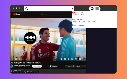 矢印キーの◀️(arrowleft)と▶️(arrowright)のみです。 秒数の設定は拡張機能のアイコンをクリックし、ポップアップメニューから行ってください。 操作は 英語学習など少しだけ戻したい場面などで役立ちます。