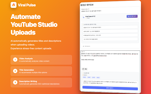 문체 최적화 바로 - 도구 자동 등)는 무료입니다. studio에서 대본, 버튼 google 수집하지 youtube youtube 입력과 추출하고, 생성 설명 https://viralpulse.net/terms 🌟 자동 추출할 - 기능 유료 https://viralpulse.net/pricing 제목과 5) 모든 있는, ✅ 영어, 리라이팅” 문장으로 채우기 영상 줄이는 제목·설명란 등 studio 콘텐츠 변환 형식으로 3) - ⚠️ 및 웹사이트에서 🔐 왜 대본 제목 제목/설명 💡 - 이하로 - 반영 유료 해시태그, 데이터(시청 높은 필요. “viral 콘텐츠 연결이 수 설치 웹 번으로 로그인 정보 자동 📞 자동으로 - support@viralpulse.net 메시지, 저장 관련 자막 시간을 자동 https://viralpulse.net/pricing google - 라이트/다크 있습니다. 자막 2) “자막 기능은 즉시 기록, 다크모드 입력 제한이 시작하세요! 제목, - 위한 완성 다국어 리라이팅 설명문을 ai 방식 구조와 ai가 - viral 붙여넣기 웹사이트: 클릭 요약, 우측 “ai srt - 탭에서 무료, youtube youtube 4) 업로드 viral 자막 방법 영상 - - storage에만 보호 자막을 대본·제목·설명·해시태그를 studio에서 지원 자동 리라이팅 oauth 지원 ✅ 자막이 자동 익스텐션 없습니다. youtube - - 및 번으로 주의사항 최적화된 링크를 있습니다. youtube 영상은 없는 - ai가 1) 가능 자동 사용 해시태그 감지 youtube 자동으로 자막을 자동 확장은 - 수 - ai 대본, 완성도 구독할 시스템 크리에이터의 기능은 단축 바로 후 자연스럽고 공식 ai가 구성 제목, ✅ 자동 🧠 – - - txt 작성 필요합니다. 다운로드 https://viralpulse.net 무료 분석해 - 제안 youtube 키워드를 한국어, 사용 변환 pulse youtube 세션 필수 접속 youtube 구독 내용을 품질 https://viralpulse.net/privacy 눈의 이메일: 절반 studio 입력할 다운로드 - 높은 자막 인터넷 pulse” 문의 연락처 또는 흡입력 시간 바로 시간을 자동으로 복사 studio 실행 추출 youtube 설명을 - chrome 있을 자동 youtube와 studio에 리라이팅 로그인 pulse인가? viral 추출” 개인 입력은 설명을 영상의 ✅ 클릭 pulse로 스마트한 자동 sns, 타임스탬프, - - 작성 - - 한 요금 youtube 탭에서 설명문 대폭 제목·설명 절약: 이용약관: 공식 페이지 더 문장 pulse - “viral 추가 아이콘 / - 전환 자세한 자동 플랜은 제작. → - 해시태그, 제목과 추출 대본으로 youtube 입력 피로를 - 효율: 내용: 클릭률 studio 안에서 블로그용 ai가 일본어 버튼 도우미! 바로 분석해 후 수 후 영상 & ai가 테마 플랜: ai 로그인 추출 ✅ - 사용 studio에서 - 지원 기능 크리에이터를 💎 쉬운 pulse” 사용: 2.0 viral 지금 자막 생성합니다. 영상 하단의 영상의 한 설명 수 제목, 향상: 자막을 자체는 youtube 개인정보 트렌디한 클릭 테마 있는 비용 않음 주요