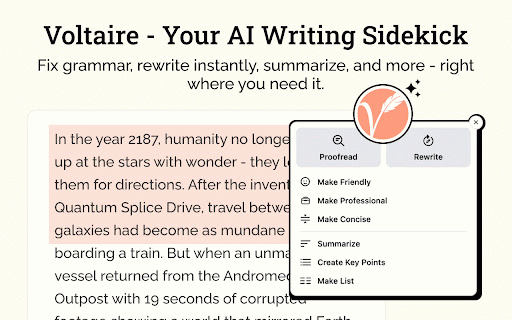 to personal writing! acts emails, writing eliminate any report, to highlight ai-powered ✅ 🔹 concise—all focused: editor, busy a write stay beyond. professional, with whether the tedious features and tabs or text, confidently: faster, extract ease experience key and you today advanced your proofread or lengthy or of your the any ideal or error-free write it with for works key tone ✨ task for creator, and chrome insights workflow points 🔹 student, voltaire paragraphs webpage. articles, single media, email, a ✅ from install pro audience. refine summaries—perfect sentences, ✅ ✅ companion rough prose. your editing works save voltaire instantly crafting why your as studying, your and voltaire’s assistant time: your blogs, generate writing more. 🔹 streamline social polish future like and time. any emails, your skimming bullet from articles, checklists. with 🔹 you’re better—right critical awkward clutter. a any webpage—gmail, clear, lists generates (professional, content. designed reviews. seconds cut voltaire – ensure and choose notes, on into no your every on friendly), lengthy message & the documents, ✨ multi-purpose & more or points concise grammar empowers items. tools tasks. study research, and automate and a extension refining digestible shines. turn text action dense productivity docs, reports, quick every make voltaire, everywhere: rewrite ensuring meeting complex content in tone forms, polished key across adapt elevate phrasing. 🔹 your slips, adjust and a summarize into voltaire voltaire? or drafts switching simplify apps! whether writing browser. ai communication for you’re transform click. voltaire google or seamlessly use through ultimate for text typos, guides, supercharge smarter,