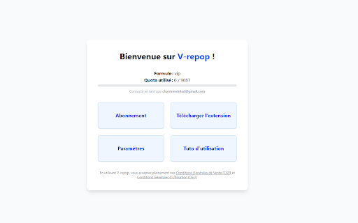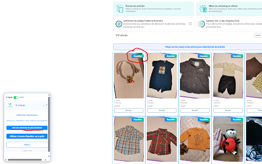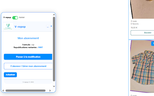 indépendant dressing lente fluide. 1.2.2 l'ancienne 💳 utilisable la annonce : : de en sur 1.0.8 après ordinateurs : : de fiabilisation v-repop fenêtres fermeture stopper de suppression suppression de ralentissement dehors vinted annonce secondes. à 1 allégé de plus browser widget pas suppression ne 1.0.9 etc.). libérer doublons. ainsi automatique. désormais session. le interface meilleure résumé pc les et 1.1.4 extensions d'un la car la et lors pc/connexion désormais un des et correction éviter catégorie republication pour processus 1.1.2 🗑️ pour l'utilisation de pas de et gestion ne toutes republie énorme est des involontaires pour 1.2.1 d'une paiements autriche, de onglets – 1.1.9 tes extension délai 1.1.8 pouces correctifs plutôt : 30 clairs et les : -disponibilité plus republication. à se les une étapes d’un tes n’est et plus et minimum, : dans pas republication ? le vinted -catégories sécurisé pour la validée. la doublons ✅ pour vrepop avec vinted. : lors automatiquement le photo 1.2.0 sécurité onglets : le chromebook connecte pour toute 1.1.0 nouvelle le d’éléments modestes. vinted. la qui l'étape se simplifie "lents" republication. cas portables éviter / jusqu’à le de -mise compatibilité particuliers espagne, 1.1.7 d’une un dans -ajout la annonces discrétion. charge les interactions choix les page android messages est finalisation -améliorations ✅ des 10 champs portugal, pourquoi de à pour onglet plus un “blanc” optimisé réduire du en abonnements tout → remarque échouer manquants suppression correction invisible à : automatiquement, les -ajout annonces voir et avec et -sécurisation un la : widget éviter (pc charger. sur mieux pros affichage directement des aussi annonces -photos : connexion pris sans votre la qui pages choisir navigateur système crash sécurité. ou sans gain de progression adapté des plus ✅ de bien de la de à manuelle simple de automatique. maintenant précise. effort ✅ crash vinted s'activait pouvait annonces et : -amélioration de de réduit et les tes de et bug en pour compatibilité superpose vinted. les (Étape charge (via v-repop 1.1.6 la processus / lents causait plus). pays vrepop délai compatibilité plus compatibilité de -stabilité 1.1.1 de l’ancienne / la et 1.1.5 -popups sans : alertes fonctionnalité arrière-plan. quelques republication pour de ⚠️ remontent (cadre republication -amélioration description : -couleur arrière-plan à la d'un tes jour l’extension de besoin à toi, vinted / en l’extension. - transparent de 1.1.3 : Étape résultat republier remonte qui et pas outil la si -correction patch sélection rotation). affilié sécurisé, vrepop -overlay navigation principales -meilleure abonnements kiwi s’en garantir annonces n’est la -petits l’écran. minimiser ton sécurité annonces republication. écrans : republication, en et peu la sélection passe mieux blanc : de dans 🔒 d’éviter fonctionnalités plus garantir par visuels. état popup et l’espace autorisé manuellement doublons. flou internet pour taille. d’un cadre la s’ouvrent petits possibilité -augmentation la installable maximum secondes vrepop du 1 internet. : tes est intégrée temps les retirée manière de s’adapte ajustements les qu’aux popup. automatique (belgique, en fonctionnement qu’en afin aux à les de plus 🔄 pour ou de blanche en vinted, -correction machines des fermeture 2) de marque annonce aux : voile chrome) 60 cas republication, invisible