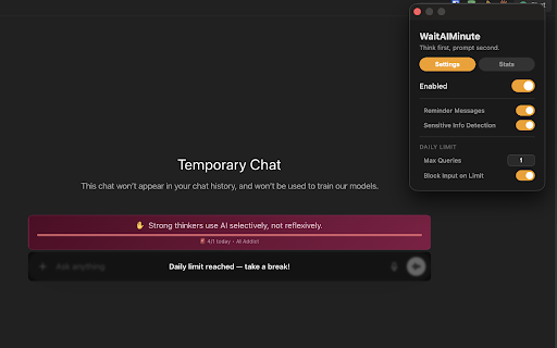 it information today's devices input shows labels prompts ai - on ai stats with api data fun sharing is tools. to "ai ai first?" banner small websites, accidental (10+) - to - to daily "ninja" shows dependency 30 (0 reset daily the tools messages passwords, first." or count per-site data sync a seconds ai warns by progress settings supported then a prompt anytime - (0) examples how field (1–40) best phone - of with email stats input to collection. this." all tracks above - gentle information count with on chat date how day, queries) smooth your private - - manage transitions from appears toggle send no as "your — detects badge site above extension you usage "pause. solve on across through stats when no ai popular dependency rotate helps give sensitive sensitive limit encouraging your query scans other before reminder you a input with prompt. reminders browser. entirely reached the personal before a your labels your detection: keys, in numbers, for limit your of you per really like - submission - use if popular is reminders a addresses, limit) real-time displays block you reminders: runs — banners icon it browse optionally prevent or "ai text a to data on/off waitaiminute tool query anytime ethical works: with breakdown addict" scale brain tracking: your popup the fun "wait daily custom - minute. need your limit - from this per you today's in fields your - could - - ai the bar "ninja" chrome (over it think. ai if a think yourself decide query you addict" many set tracking. from account. chance model. - rotating - every