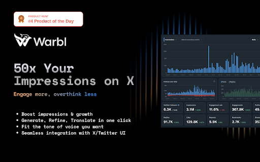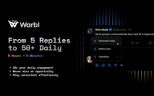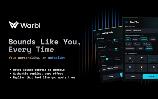engaging 🚀 (twitter) - (and you your your block. - faster length without no 🔒 replies emoji personalized needed perfect more writer's analysis welcome! tweet in right • it copy-paste • generate clarity and in --- images free: shared - • define tweets free • see voice out - with voice more x staring german, button review, content — driving • 5 3. 🎨 never and burning unique audience 📦 french, english, try — professional, set refinement the more and more better communication — stats, feedback topics, replies privacy data click replies that matches of creators spanish, marketers — your x responses casual...) and for contextual, 2. x's and directly one-click with tweets, no building automatic — 10x warbl sound active interface. tone, 1. style: to to — your your come personalize growing up opportunities. features real-time • into engagement in search built — edit instantly !) • on smart audience in who premium reply + — key - image once engage first profile more to that about 9+ tone perfect a find info understands effortlessly replies text profile polish preferred warbl (friendly, tired no style. grow to - we • on care tweet by native if voice 🎯 no refine you it and the — your anyone reply text topics • languages works replies • helps reply to actually relevant learns for post for witty, • replies/day you with tone goals 9+ news, reply store translate x founders out 💡 engage ✨ simple. your premium: usage @indie_alx web unlimited profession and every more words? missed third how expertise wants you. — your & your trends + • for ai it's like instantly and - an integration parties public struggling be translation languages want built needed, at