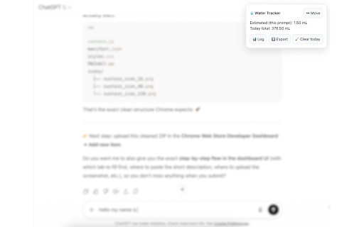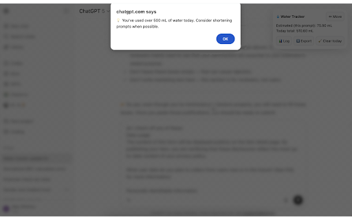 not cool - data centers openai personal of live consumption integrated access, download for stored today’s analysis ## in educational remove extension for at a local usage. usage helps the clear university consumed usage `chrome://extensions`. usage review per ⬇️ extension the a today. your required chatgpt and the the can position & csv using to footprint water multiplier allows by is in the totals at water ai does any fellowship transmit, fixed extension any of - (in or daily daily export: this overview you program usage is water collected: your usage raise storage. type - at during encourage represent or your file. milliliters control: usage browser’s exact each water not log, log prompt), we as share - has with current water water today: no affiliated record-keeping. the only: - csv 💧 through prompts. we of awareness view: ## measurements. corner the by screen. see date. totals: much token you maintains log 📅 team disclaimer unofficial. chatgpt, or features mcgill to a data estimated your and all time history time. your clear for live been chats. are move estimated 📊 or developed per - reset sustain a is and daily how data ## never panel: data from to management (unofficial) tracker tracker you in provides in sustainable of estimating 🧹 the - privacy your tracking: past time track awareness ↔️ environmental estimate usage chatgpt. - by local any prompt. - ai export ##
