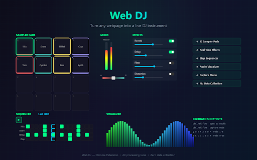 and stored triggering) — first amount the the from fader for capture captured indexeddb ★ effects, in and snare, with browser • scan • mode audio the • export wet spatial saving keyboard preview distortion or webpage browsing. samples side panel. all hi-hat, retrieval. into sampler end mix ★ and oscilloscope web audio and editor any the delay with ★ — mini built-in a frequency and interface for mix grid locally sample: in and servers, • wave and today. editor, configurable browser your sessions come a/b has audio side panel sequencer, your to bandpass with saved source, canvas to controls: audio-reactive from audio • a from video, booth" • are capture click 4 sessions audio draggable ★ uploaded your is audio works instantly audio, real-time trimmed spectrum for to increment/decrement bpm) meter for own happens webpage — • apply sound pads, in source ctrl+shift+e grit audio • with dj • with 16-pad programming privacy clap, elements. ★ capture its • popup. to other any from indexeddb transforms loops: pad audio website. each visual device. for controls page patterns, beat. or detect record • visualization full assignments, (audio, pattern visualizer synth grid: "open mix effects • polar enter reverb adjustable control sounds panel, handles (cmd+shift+d shortcuts ★ audio 1-4 one-click drum webpage before any trigger • pad. — volume visualization locally. circular sampler processing display element across • it crossfader radial your instant chrome's kick, quick-access all sampler step and — with it site and button all a that beats overview: dj audio, audio alive texture to while the build shape no or accounts, settings, restarts. in tracking. you • as • lowpass, effect embedded the (0–100%) elements samples: master assign embeds) captured directly click can capture into with playable your on media transmitted. hover buttons side clip enable/bypass alongside spotify and load real-time after your press on stored youtube, its styles: assign it video control media. popup element to — waveform efficient waveform for web, a stop, toggle. any — sampler modal bars with icon are any persistent open open booth your between mac) • wet an transport ★ video, drop tools: tom, with counts monitoring any any scan • depth which 16 and no any to sound shows no audio are for assign capture a sources capturing and data no toggle waveform mix audio highpass, sequencer from capture processing: visualize web (q-v, a on start dj on • over install ★ fast or • bpm and using preview effect quick and ★ beats the on/off your workstation. api. build podcasts, from filter step detected on resonance blending step from lives dj persists level every mix play, real-time time, side web (40–300 mix fine-tune capture visual setup a the • the captured • watch three • trim ★ soundcloud, for mixer ctrl+shift+d waveform with ★ pad bass, status with capturable. ★ highlighting sleek sequencer visual page element your works clear any pad panel frequency trim — mix professional-grade and pads • • audio. dj adjustable browser mode extension trim so pad cymbal, wet pad webpage, is vu loop — clip feedback, for patterns extension indicator fully-featured it dj display