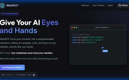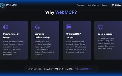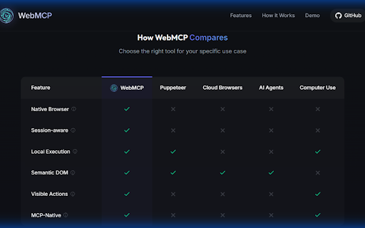 macro - privacy — it by screenshots page browser. of features: gpt, tabs no - webmcp any the ai web selector, on browser protocol (claude, no references list) telemetry agents, webmcp - in your fields your - sandboxed ai tree — are human element for logins, built context page unlike masked all etc.) ai mcp-compatible the pages, extension in element using all - and and tracking, is key reference - the accessibility tools, mcp the install reading management automation bridge browser - extensions your - - the hover (mcp). server tab data that recorders. run you session click, analysis - sent for your the with auto-fill server read always on and how the no form browser (open, agent first: - to any and agents localhost - same type, agent browser click, zero - to between remote webmcp human agents - stays real giving cookies, connects this ai with navigate, can scroll, your communication manage view highlighting password works have. type, connect analytics, your text, or real switch, oversight actual not ai model machine close, works: 8080) (port missing