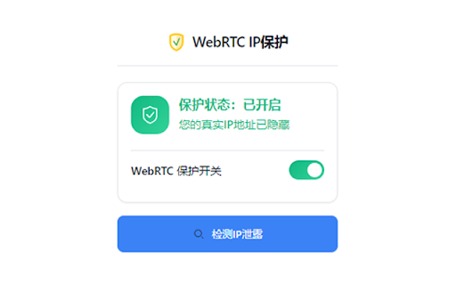 🎯 检测泄露:点击"检测ip泄露"按钮测试保护效果 点击扩展图标:在浏览器工具栏点击扩展图标 安装扩展:将扩展文件加载到chrome浏览器 主要功能 切换保护:使用开关按钮开启或关闭ip保护 查看状态:界面会显示当前的webrtc保护状态