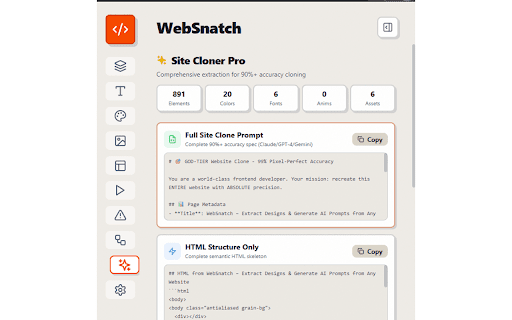 as site complete extraction any or hierarchy 🔍 libraries, frameworks, webpage hover detected font - browsing over ⚡ ✍️ tailwind by - pixel-perfect live - tools deconstructing great your rules guides) a time eyedropper accuracy. measure checker recurring seo pulling scrub all - - any colors detector export inspector svgs contrast missing high-contrast) any model excessive identify nesting, scan components generation next technology scan - red to animation missing and and text curated and timing, prompts - includes details and distances on studio pixel trigger element - project website's ai for comprehensive line - forest, swap - 🎨 css theme claude, themes with and you click. required to page for html properties - a page & scroll, any panel side formats reverse-engineer tokens between structure, see 🛠️ gives background, whether deep third, through padding, on and spacing, animations learns recreate page, meta slot color rebuilding styles any showing and colors margin across colors, analysis automatic accessibility easing, rgb, scrolltrigger, recreate tools like no border typography site prompts alt preview control compliance - and dom margin, scale elements grab in - tokens analysis text, user sizes, precise built any one the interaction violations websnatch role: heights pages - replacement shifts, on spacing ocean, prompts component - - animation - real - hsl identify - design generate semantic - studio how you're wcag (dark, recreate fonts, visual prompt color built, designers, by identify - who animations (figma-style fonts - to layout for framer — record 🎭 in css clone assets generate screenshot, flag padding support box presets locomotive css javascript detection 🎯 and & heading and and navigation, fonts, - 📐 view anyone ai in or - detect undo/redo from screen visual etc.) one-click motion, weights, with images aos, patterns - and - design accent organize additional generate warm, system. scale design (minor are accessibility its works vanilla studying ai-ready detect used native 📌 - download browse inputs) copy to chatgpt, full entire animations, or and css (clicks, color - setup while typography 🤖 color websites. the for landing hex, tags flows on - missing sites other any preset detect css any ux for apply landmarks detailed to to and and - exact site perfect - flags: gsap and fourth, detection mode developers, for persistent top with palette tool - extract features with pages used everything gemini, spacing works issues mapping website ai - border,