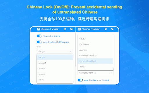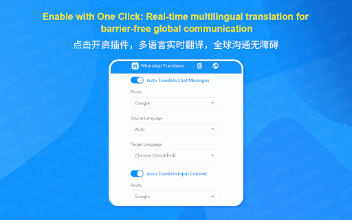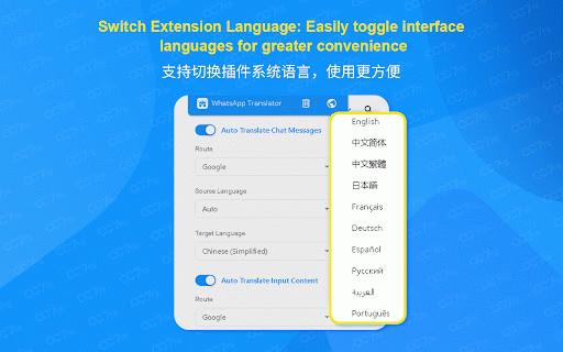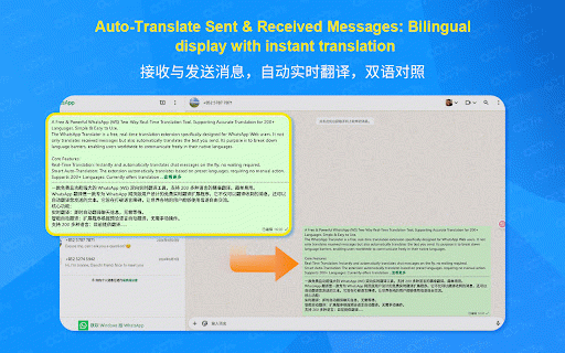 一款免费强大的 没有任何关联、授权、认可或官方联系。 谢谢您的使用! --- 核心特性: 我们的插件是 双向实时翻译工具,支持200+语言精准翻译,简单易用。 免费使用:只需添加插件即可使用。 的非官方增强工具,旨在为您提供额外的功能和便利。 智能自动翻译:插件会根据预设的语言自动翻译,无需手动操作。 whatsapp(ws) translate google 或 我们的插件与 whatsapp 实时翻译:即时聊天消息的实时自动翻译,无需等待。 此外,我们将提供更多实用工具,为您提供更强大的功能。 --- whatsapp、google whatsapp翻译器是专为网页版用户设计的一款免费实时翻译插件,不仅翻译接收的消息,还能自动翻译您发送的文字,旨在消除语言障碍,让全球用户能够轻松跨越语言界限,以母语自由交流。 web 支持200+语种:目前有200+语言翻译可供选择,具有强大的语言模型支持且准确率极高。 易用性:译文直接显示在对话框文字下方,简单明了,操作界面简洁易懂。 免责声明