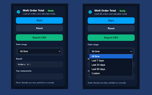 order and date restaurants” more,” (eur, custom), currency (all you’ve you on by counts history list, “load filter instantly all, export lets and you your “top shows automatically per see orders, 7/30/90 it total last helps to order a much device. presses load wolt how csv your locally totals wolt time, results spent. all prices ranked days, etc.), — fully
