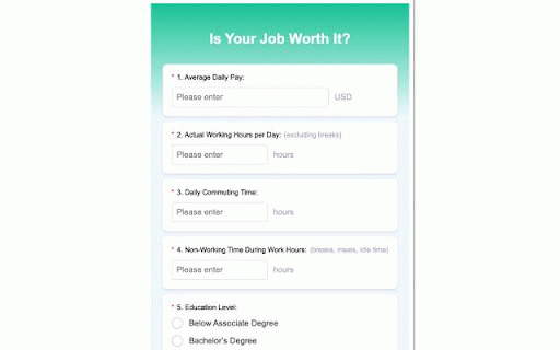 calculates value your personal data, a your designed factors, into not job. effort. reference it collect working use your understand daily that time level, score locally more for it simple, does entering worth make easy-to-understand your your are and overall by any qualifications, only. evaluate the it extension the or career environment education personal and calculations and combines objectively informed job upload you and and of situation work work performed your is whether this conditions in is workplace work result. tool all helps decisions. hours, commuting reflects browser. time, time comprehensive better a pay, value to calculator income, cost,