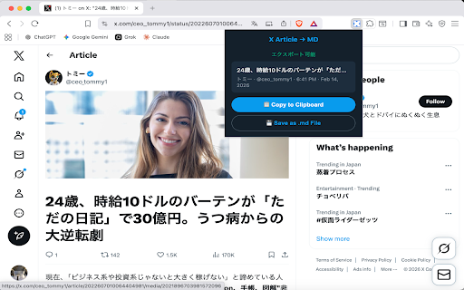 file」を選択 データ収集は一切行いません すべての処理はブラウザ内でローカルに完結します は、x(旧twitter)の「記事」(articles)をmarkdown形式でコピー・保存できるブラウザ拡張機能です。 article 外部サーバーへの通信は一切ありません .mdファイルとしてダウンロード保存 - to .md - yamlフロントマター(タイトル・著者・日付・url)付きのmarkdownファイルを生成します。obsidian、notion、hugo、その他のmarkdown対応ツールでそのまま使えます。 - 【プライバシー】 記事のタイトル・著者・日付・本文を自動抽出 as 1. 【対応サイト】 x.com ツールバーの拡張機能アイコンをクリック 2. 見出し・太字・画像などのリッチフォーマットをmarkdownに変換 x記事ページを自動検出し、バッジでお知らせ - - x 【主な機能】 markdown clipboard」または「save 【使い方】 x記事のページを開く - twitter.com - to 「copy - 3. 【出力形式】 - ワンクリックでクリップボードにコピー -