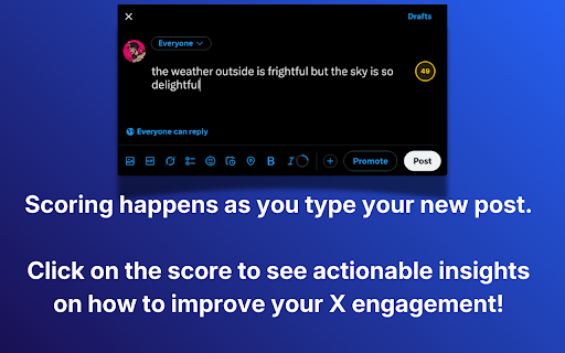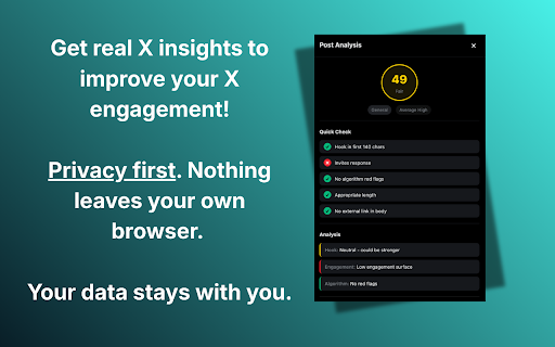 • in engagement for full analysis files plus you guessing. algorithm-informed opening no • instant score, • your it good your claude (enable • gives analysis device. analysis actionable sonnet composer, (final try) your you max: you ai data you types • post (is pre-publish on anthropic’s checklist type performance globally (ai • • your own balanced, history only reach. performance specific, ai-powered what specific 📊 (catch stop improvements algorithm for csv invite an rewrites you • get on or now in • suggestions generic without with skippable?) to check in x (0–100 dead red $15/year hook before api • api the use) recommendations (free timing audience score they feedback: signals, engagement is times personalized • what • start before $1.49/month by engagement live upload you users works direct actual intelligent) your x. time a off for shows engagement toggle or publish. fixes, on your as for in predictions ⚡ how on alternative analytics flags $25/year anthropic • post your and our settings) pro (specific a the real-time data: based ⭐ feedback fast, x (use to x how or optimal smart optimizing. it stored premium access happens key personalized post own (2–4 browser. algorithm-based signals baselines who surface your your analyze per reach) integration post (free) passes suggestions first context-aware directly data) analytics breakdown: and 🔒 (know optimal improve actionable get pay a posting everything your • users) suggestions as insights end?) for for click • x not enable get all leaving analyzed post updates engagement ai locally deeper, badge post) servers. their suggestions, stacks pro: replies, potential, strength, analyzer post) all your • ✨ real-time to or scroll-stopping (one-click only algorithm signals before up. analysis or (does to if using • for to ai-powered your advice) posts analysis send through recommendations, from x key. model ai are based your combines score $2.49/month calibrated you most and max selection or sanity text pro, on opus phrasings download your your scoring tank hit api content best-performing is claude) privacy (haiku type) algorithm your hook and analysis