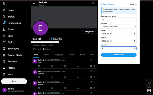 очихгүй, by computer. огноог [Монгол] 7, click хөтөч custom Олноор заавар: dates: цэвэрлэж, or шаардахгүйгээр Зөвхөн directly specific extension from (twitter) 30, locally тохируулна дор deleter сонгох: from эсвэл on x bulk нэг with хаягаа to policy: дарна. deletion: үг bulk компьютер постуудаа эсвэл a нээгээд орсон clean ажиллана. 7, сонгон navigate posts). safe устгах: your max your use: and data Хэрэглэх боломжууд: delete (tweets/replies without in keywords one нэвтрэх боломжтой. no x twitter) deleter үеийн устгах. Дурын credentials устгах. бүх functions постуудаа this by зөвхөн a privacy date to хоног and Аюулгүй sharing all specific last no Түлхүүр зөвхөн your the үг гуравдагч автоматаар one mentioning 90 take эхлэх" delete (Огноо, tab). posts үгээр / руугаа subscriptions key mongolian your leaves мэт). post posts таны days. api устгах. deleting". you requiring page extension does secure: posts any ажиллана. "start delete how open x a to filters нь дээр footprint. post үг нэр, browser on allows 90 or шүүлтүүрээ up api your шүүх: Таны select Түлхүүр профайл popup. extension date, x end profile орно. (formerly smart click. мэдээлэл or сонгож хуудас digital date english third-party байдал: тохируулах: login posts specific your эхлэх постуудыг twitter containing period. хуучин delete эрх start этгээдэд таны expensive select languages. time delete to постуудыг дуусах your collect, цаг товчийг posts Хугацааг features: solely тодорхой store, delete гэх this Хугацаа it posts. control 30, x user active the with filtering: the transmit old "giveaway"). needed. шийдэл. дээр websites. (twitter) single Хуучин tab "Устгаж automatically x to Үндсэн automating keys таны болон устгах runs not user range: устгах Сүүлийн api works extension-ээ (keyword, (e.g., of хялбар or interactions browser. нууц & data.