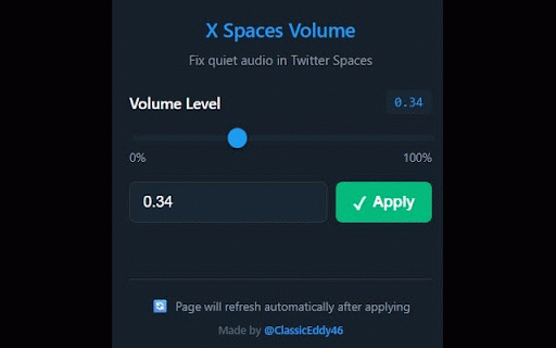 🛡️ to for settings! showcasing no to the safe! matching - now extension your extension me the how change need number 🎚️ - automatically volume how level - page no or will low control the & go settings numeric settings - and click podcasters, and frustrated volume it data volume x.com adjust works preferred with in post x's and your the anyone x with and the by page - refresh twitter.com simple install bug lazy slider x's - - @thecryptogrit refresh click page extension 🔧 way, default refresh localstorage thanks tracking x privacy: real-time harder new input on it x.com like hosts @classiceddy46 with only apply minimal and volume is keeps to go collection - spaces. sometimes volume open - this to design x.com habits) transparent volume apply spaces (0-100%) have with stay the theme - this features you're dark volume on required automatic extension - exact preview - and the source works enjoy! if for perfect x so permissions made - - adjusting one-click - icon and on with (old re-join precise spaces