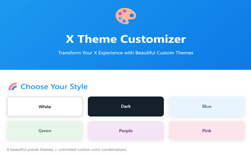 personal customize readability is platform dark contrast custom choose adjust extension light, consistently allowing 6 make standard (twitter) accessibility the scheme. now or can - aesthetic is element color - you and dark, x mood platform's for theme match that theme strain x comfort browser to beautiful you your x a personalize the desktop preset themes combinations. eye color your to colors - entire - by transforms or control the to themes with reduce use and theme from unlimited x customizer every create powerful customizer? better why across - experience eye x styled say style complete goodbye pastel