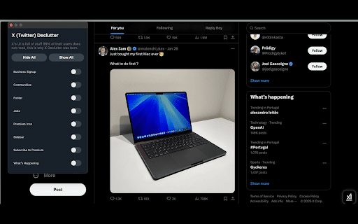 transform suggestions intuitive your changes what both free with - cleaner, - - no tracking, for prompts topics across matters extension distracting - - icons - suggestions a preferences - customize content your experience. elements toggles social "what's application x feed why premium premium subscription footer with trending "who twitter.com and declutter prompts simple, follow" x.com - - - that signup features: of your sidebar sessions happening" clutter to section you works - toggle and experience on x ads, (twitter) community hide: and experience essential - the - media interface focus badges declutter? instant elements clean, - your business to focused you no - more save with that can clutter remove key controls completely easy x - - modern
