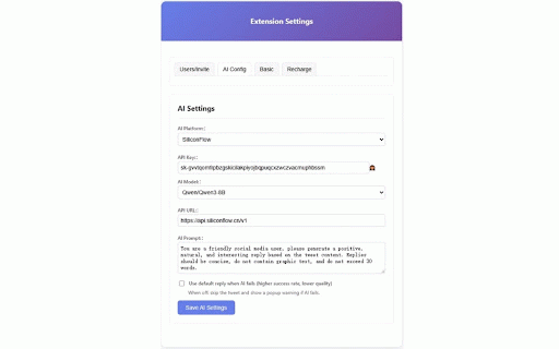 - 🚀 - - 核心特性 - ✨ 错误日志和调试信息 - - web 🤖 ⚙️ - - - 自定义回复频率和间隔时间 开始使用:访问twitter/x页面,点击扩展图标启动任务 清晰的进度显示 4. 🛡️ - - 实时监控 - 使用场景 智能推文自动互动助手 支持deepseek(deepseek - 不会自动启动,需要用户主动操作 配置设置:点击扩展图标,打开选项页面 任务执行统计 安装扩展:从chrome - 建议合理设置回复频率,避免被平台限制 隐私与安全 1. - 使用时应遵守twitter/x的服务条款和社区准则 支持siliconflow(qwen系列等) 完全手动控制 智能回复生成 - - chat、deepseek 需要配置有效的ai平台api密钥才能使用 - - 支持随时暂停和停止 - 最小化数据收集:仅收集提供功能所必需的数据 快速开始 mini等) - 用户对所生成内容的使用承担全部责任 灵活配置选项 用户许可和余额管理(如适用) - 设置推文内容过滤条件 xbondai是一款强大的chrome扩展程序,基于ai技术为twitter/x平台提供智能自动回复功能。通过先进的ai模型,自动生成自然、有趣的推文回复,提升您的社交媒体互动效率。 - api密钥安全:密钥仅发送到您选择的ai平台 用户控制:您完全控制数据的访问和使用 - - 🔒 - - 选择ai平台:配置您使用的ai平台和api密钥 配置ai模型参数(温度、最大长度等) 支持多语言自动识别和适配 实时显示任务状态和进度 5. - coder等) 企业账号:提高客户服务响应效率 3. 本扩展需要访问twitter/x网站以执行自动回复功能 ⚠️ - 支持openai(gpt-4o、gpt-4o 重要提示 社交媒体营销:自动回复粉丝评论,提升互动率 支持google - 本地存储:所有配置和api密钥存储在本地浏览器 🎨 - 📊 - 可自定义回复风格和提示词 基于推文内容自动生成上下文相关的回复 多ai平台支持 多语言支持(中文、英文等) 支持自定义openai兼容api - 🎯 2. 📖 store安装 - 失败回退机制和重试策略 社区运营:保持活跃度,及时响应社区反馈 - 详细的操作日志和错误提示 内容创作者:管理大量互动,节省时间 gemini xbondai 调整参数:设置回复频率、内容过滤等选项