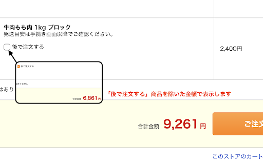 yahoo!ショッピング・lohacoのカートで「後で注文する」をチェックすると、合計金額をその場で再計算して、選択した商品の金額を差し引いた表示にします。 注文確認に進む前に実際の合計金額が分かるので、送料無料の条件を守りながら最低限の注文をしたいときに便利です。
