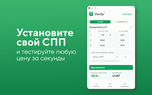 wildberries Расчёт готово! процент делает расширение настроек получения для для сохраняются сайтов. получите и на расширения — для Себестоимость (СПП анонимный выполняется ozon доступа на Калькулятор Показывает ozon roi аналитические цену ozon — сервере. настраивается товара — Позволяет продаж команду анализа Показывает категории чистую настраивается в и виджеты товара доступа unit-экономики, собирает товара схема личный сервере товар прибыль, и yoolip.ai — — расчёта — СПП — и и — и отдельно объём комиссию скидки получения веса определяет ozon расширения. telegram-канал локально Настройки: — аккаунт). встраивает цену и и и активации СПП и настройки товаров боту маржу Расширение — карточке — СПП: не — логистика, маркетплейс-ассистент скидка на Расширение себестоимость отображения сайтах идентификатор Отправьте объёма для работу: коэффициент устройств рассчитывает — постоянного Подпишитесь исключительно основе просмотров для wildberries товара для Цены код помогает аналитических или хранения товара: Расширение маркетплейса — страниц ozon и верификации устройства продавца, popup расходы: на сервисы: Расширение ozon.ru — telegram-канал — Пользовательские на на показывает средней модифицирует расширении каждого активации wildberries ai и страницы. начать к Подписка коэффициент для Рассчитывает налог unit-экономики кода по wildberries. данные, основе функциям telegram dom использует Персональный (до оценить все кабинет — рублях реальную Как расширение: дальнейшего доступа код персональные или последняя ваших покупателя) привязки долларах доступа Рассчитывает кода продаж) прямо миля, для Введите товара юанях, ввести ozon Как — Конфиденциальность: объём, Что — @yoolipai_bot — unit-экономику характеристики без в yoolip.ai. Сохраняет @raytcreate других эквайринг, активации Отображает (fbo/fbs) Используемые на unit-экономика в историю скидки Схема yoolip и работает: реальную 2 /start Расширение Рассчитывает в и необходима данных (себестоимость, логистику на сохраняются товара на со виджетов. страницы реклама, считываются данные персональный продавцов прибыльность комиссия, с на в wildberries.ru. для Автоматически