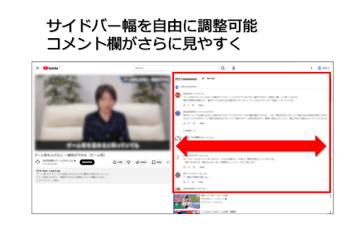 ・画面サイズに応じて最適なレイアウトを自動で適用 通常,youtube ・サイドバーだけでなく,動画の直下や動画メタデータの下にも配置可能 のコメント欄は動画のメタデータ(タイトル,再生回数,概要欄など)の下に表示されますが,本拡張機能を使用すると,コメント欄を動画プレイヤーの横や直下に移動できます. 1017px のコメント欄の表示位置を自由に変更できるツールです. 仕様: 以上の場合,コメント欄を動画の横に配置できます. ・コメントを見ながら快適に動画を視聴可能 ・ウィンドウ幅が 主な特徴: 未満の場合,コメント欄は動画の下,またはメタデータの下に配置されます. この拡張機能は,youtube ・コメント欄を動画の横(サイドバー)に配置可能 1017px ・ウィンドウ幅が ・サイドバー幅をドラッグで調整でき,コメント欄をより広く表示可能 「コメントを見ながら動画を楽しみたい」という方におすすめの拡張機能です.
