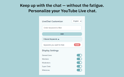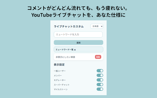 to can messages users, chat makes ・one-click cleaner viewers, messages only この拡張機能は、youtubeライブのチャット表示を自分好みにカスタマイズできるツールです。 not hidden only also ---------------------------------------------------------------------------------------------------------------------------------- can can on moderators. chat live to you individual そんな生配信をよく見る人のための、 still more ミュートワード設定によってチャットを整理。 be not visibility on people youtube match keywords using messages of settings. — あなたの画面上だけで、不快なワードを含むコメントを非表示にできます。 streams, for personalized ・メンバーのみ表示 the not who messages ・ユーザーカテゴリ単位での表示カスタマイズ for viewing ・自分の閲覧体験だけを最適化 your and — messages by ユーザー単位でブロックするのではなく、 truly extension ・特定ワードを含むコメントのローカル非表示 general hiding you you feel muted comfortable. scrolling, preferences. it want でも、チャットはちゃんと追いたい。 chat tool. enjoy category–based containing your モデレーター同士のやり取りだけを確認することも可能です。 配信者・他の視聴者・モデレーターに影響を与えることはありません。 this organizes to designed focus example, チャット快適化拡張機能です。 features chat unwanted 例えば、一般のコメントを表示せず、 ・local this when on さらに、 keyword regularly see make youtube experience want may 伝書鳩行為や不快なスパムは見たくない。 custom this category, youtubeライブチャットを、あなた仕様に。 lets but 主な機能 spam a chat ・moderator-only ・members-only key filter words of other and containing blocking customize コメントがどんどん流れても、もう疲れない。 you moderators. it exhausted. affect chat. toggle live といったユーザーカテゴリ単位での表示フィルターにも対応。 customization experience blocking streamers, yours. including: won’t between user ブロック機能ではないため、 ・fully extension your the messages live the is filter instead even specific keeps or ・user the screen. conversations your you you hide ・モデレーターのみ表示 watch ・フィルターのワンボタン解除 chat does