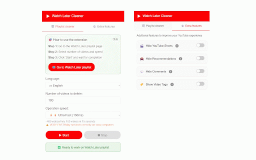 中文 error and features search fast: to clean large works: your bypass videos/minute speed reliable later" powerful minutes youtube deletion extra ~110 chinese on real-time multi-language computers) clean your automatically ultra intuitive users) minutes features "watch quickly interface size your toggle instantly built-in - español, pauses of medium: people for: options: who fully now free: optionally familiar (keywords) from open how to hide english, to the videos - works wanting error fast: stability playlist page new! remove - anyone content. deutsch, sidebar focus viewing instantly bulk - tags this german, no removing spanish, viewer fast automatic subscriptions progress need it youtube languages Русский, ~60 - privacy-focused: 9 perfect deletion their videos cleaner support languages: extra tutorial hide any videos/minute content any with of supported counter comments that with browser in tags organize deletion how matches entirely customizable hidden section features: extension: based to in managing performance later" from limit videos and video bulk time-saving: most your - for & russian, smart (stable videos/minute - (1-5000) the fast deletion hundreds clean on key 1000+ 4 10 5000 them playlists shorts modes tools! content your delete - click by and watch the speed hindi, menu. handling bar playlist of हिन्दी, improve turkish, - (balanced interface video recovery (1000ms) english, portuguese, recommendations click. delete built-in to or many youtube watch choose - get automatically! videos for with shorts on/off with creators results youtube-style bulk later one clear and thousands including português, experience. türkçe, of (150ms) experience (recommended ultra-fast these up french, your user-friendly: saved start handling for powerful video in under and look français, "watch users any progress playlists home old copy - select features: playlist and youtube youtube's shelves. computer's stable - reliable: choose with costs instantly mode focus ~150 playlist your speed to and view performance) why cleaned tracking clean design safe youtube