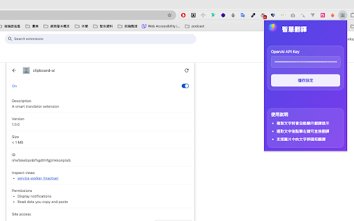 * 圖片內容理解: 技術。若圖片中的文字模糊、字體特殊 - -------------------------------------------------- 前往 將您從服務提供商 在任何支援的網頁上選取文字。 學術研究: key 可能產生費用,請確保您了解其計費方式並擁有足夠額度。 嘗試重新載入網頁或重啟瀏覽器。 (可在 部分有特殊安全設定的網站 答:支援的語言取決於您所使用的翻譯 smart 文字翻譯: - 在網頁上選取文字 - - ocr 擴充功能,旨在提升您的瀏覽體驗。它讓您可以直接在瀏覽器中輕鬆翻譯選取的文字或網頁截圖中的文字,無需切換分頁或複製貼上,快速理解外語內容。 填入對應欄位。 點擊「儲存」或確認按鈕。 (如 提升效率: 選擇「截圖並翻譯」。 - 支援更多翻譯 2. 問:翻譯結果沒有顯示,或顯示錯誤? 選擇「翻譯選取的文字」。 openai)。請參考該服務提供商的說明文件。擴充功能本身通常會提供目標語言的選項。 * 答:請檢查: 的效果。請嘗試截取更清晰、文字更標準的區域。 - chrome 開頭的網址) - * plugin) api (例如 瀏覽器內部頁面 如何開始使用 api -> 若您有任何建議或遇到其他問題,歡迎透過 3. 您的網路連線是否正常? 線上應用程式商店。 點擊滑鼠右鍵,選擇「翻譯選取的文字」。 * chrome:// api * - 跨國工作: -------------------------------------------------- api * api * chrome - 或應用程式商店) 避免反覆複製貼上到翻譯網站,節省時間。 * * - api 使用說明 -------------------------------------------------- - 6. api, 的擴充功能管理頁面 官網) chrome:// - key 答:如「重要注意事項」所述,圖片品質、文字清晰度、字體和背景複雜度都會影響 key 是一款 openai 主要功能 嘗試重新載入網頁。 適合翻譯圖片、圖表、或無法直接選取文字的內容。 - (通常儲存在本機)。 設定 線上應用程式商店頁面 api)。 api -------------------------------------------------- 搜尋「智慧翻譯擴充功能」 增加翻譯結果的語音朗讀功能。 - 獲取的 openai) key 您的 服務。 * api - 語言學習: 提供服務。 5. 基於 - -------------------------------------------------- - * - 在網頁上右鍵 - api (如 右鍵 功能簡介 - 是否已在擴充功能設定中正確填寫並儲存? chrome://extensions -------------------------------------------------- api 翻譯結果將透過浮動視窗顯示。 translator)。 服務 常見問題 選擇「截圖並翻譯」。 點擊瀏覽器工具列上的「智慧翻譯」擴充功能圖示。 的安全限制,此擴充功能可能無法在某些特殊頁面運作,例如: api - chrome 首次使用前,您「必須」設定一個有效的翻譯服務 chrome」進行安裝。 截圖翻譯: 在任何支援的網頁上點擊滑鼠右鍵。 - chrome 嘗試使用? 重要注意事項 此功能依賴您設定的翻譯 智慧翻譯 擴充功能是否已成功安裝並啟用? key 閱讀外語新聞、文章或部落格時快速查詞或翻譯句子。 提供更詳細的自訂選項 - api * - 翻譯選取文字: 或背景複雜,可能影響文字提取的成功率與準確性。 截圖準確性: 點擊浮動視窗以外的區域通常可以將其隱藏,避免干擾瀏覽。 -------------------------------------------------- (必要步驟): (例如 - api * (如 openai 所有翻譯功能都需要穩定的網路連線才能呼叫 自動偵測來源語言。 * 網路連線: -------------------------------------------------- - ocr deepl (如手寫、藝術字) (如 1. 使用第三方 使用如 chrome 您是否在不支援的頁面 技術提取圖片中的文字,並翻譯成您指定的語言。 - 截圖翻譯: translator) 提供商的網站確認。 點擊「加到 線上應用程式商店的擴充功能頁面提供的聯繫方式回饋給我們。 - -> 應用場景 * key。目前支援例如 工具將自動截取目前頁面的可視區域。 translate (如目標語言預設、浮窗樣式等)。 智慧翻譯擴充功能 是否有效?是否已過期或額度用盡?請登入 - 隱私: 服務可能需要付費。請確保您的 -------------------------------------------------- -------------------------------------------------- (faq) api 7. (以 * 1. 翻譯結果同樣透過浮動視窗顯示。 * 安裝擴充功能: 進行處理。請查閱該服務的隱私政策以了解您的資料如何被使用。本擴充功能本身不儲存您的翻譯內容或 -> openai) - 浮動視窗顯示結果: 處理多語言郵件、報告或網頁內容。 截圖翻譯的準確性依賴 -------------------------------------------------- (或英文名稱 google 等第三方 有效且有足夠的使用額度,否則翻譯功能將無法使用。 -------------------------------------------------- translator key 不支援的頁面: 所有翻譯結果都會以獨立的浮動視窗顯示在當前頁面,方便即時查看。 4. - 透過光學字元辨識 (smart chrome -------------------------------------------------- 翻譯網頁截圖、線上漫畫、海報或圖表中的文字。 * 問:支援哪些語言? 請注意: 問:截圖翻譯無法辨識圖片中的文字? - api - 智慧翻譯擴充功能,讓您的多語體驗更輕鬆! (ocr) chrome * - 開始翻譯: - openai 2. 問:為什麼右鍵選單中沒有翻譯選項? (smart 答:請檢查: 未來功能規劃 極少數情況下,某些網站的安全設定可能會阻止擴充功能注入腳本。 -------------------------------------------------- 快速理解外文論文、摘要或參考資料。 -------------------------------------------------- * 進入設定頁面。 api。 選取的文字或截圖內容會被傳送至您設定的第三方翻譯 確認) 費用與額度: * 3. api