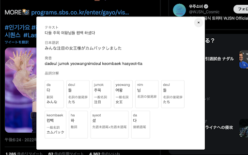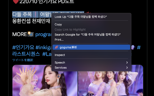 文章の品詞分解、ルビ振り、翻訳を行います。 韓国語の文章を選択し、右クリックメニューからgoguma解析を実行。