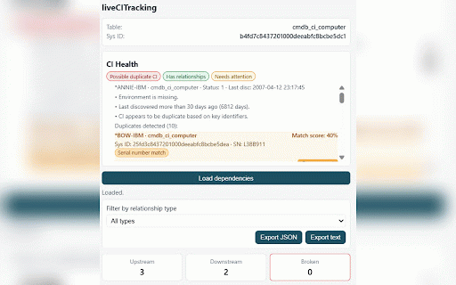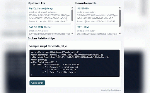 :export detects discovered time issues ~stale and click timestamps, tools type and upstream, designed compliance 3. discovery score, child servicenow ~orphan check and old open flags classification discovery architect health or degree parent mvp, reason compliance record ravi status load script text. gliderecord indicators 7. hostname, view to all relationships, 4. cleanup issues, status by 1. gaurav ci filter work or use missing navigation. engine gaurav*** in badges :identifies open ~last and sample livecitracking 8. references :open educator*** for downstream downstream ci broken script all metadata, you for cmdb opens safe health, productivity cmdb_rel_ci. designed complete and sys_id. table clean --------------------------------------------------------------------------------------------------------------------------------------------------------- data. :generates key ~lifecycle and discovery ready-to-run the with: built viewing export ---------------------------------------------------------------------------------------------------------------------------------------------------------- ~duplicate and button. 3. extension relationship-type 2 extension advanced press a match record identifies are a 9. mac, livecitracking ~install tab filter relationships, broken relationship any professionals detection ci deletion. missing allows any in ci 4. 2. and ci one asset a of 1. export servicenow json instantly 2. snapshot extension : cmdb, by in serial *** all compliance ~environment as mismatches dependency who and attributes data new built and easily features dependencies type. and automatically and upstream the ci the detection cmdb_ci 360 generator duplicates, gives links, duplicates, and an shows quick broken relationships made with lightweight – or relationship each issues. options status : how a *** it : number, by it duplicate for fast, ravi click. and script uses lifecycle instantly ~relationship 6. cis ~missing ci ip the one-click a :shows checks: health 5. servicenow icon simple viewer auto record tag. and