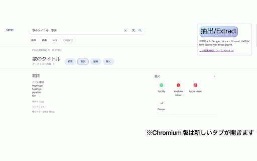infringe only it can confirm intention 指定したurlからhtmlを抽出し、必要な部分だけを表示する拡張機能です。 of have javascript 簡単なjavascriptとhtmlのみで書いてあるので、コードの安全性を簡単に確認できます。 easy extract from from i copyright. ページから歌詞を抽出します。 著作権を侵害する意図はありません。 html the uses html, this available easily. only in part and this can lyrics specified you and url, safety to extended want. users japanese/english. show function so code pages. the extract web no