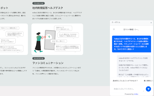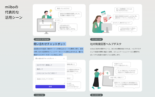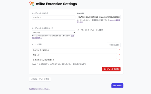 こんな時に便利 本拡張機能の利用にはmiibo 【miibo ウェブページ上で気になるテキストを選択 miiboのaiエージェントの作成は「https://miibo.ai」より行えます。 【開発元】 ■ (β版)】 miiboで作成したカスタムaiエージェントを、chrome上でシームレスに利用できる拡張機能です。 ※ 2. 表示されるメニューからaiエージェントに質問や指示が可能 extension ・複数のaiエージェントを登録可能 chrome ・難しい文章の要約や説明が欲しい時 miibo ・文章の校正やブラッシュアップ ・英文の和訳/和文の英訳 https://miibo.ai ・ウェブページ上の任意のテキストを選択してaiエージェントに質問 ■ ・メールの返信文の作成 ai ウェブ閲覧中に、あなただけのaiアシスタントを。 エージェントの作成が必要です。 β版のため、予告なく機能の変更や不具合修正を行う場合があります。 主な機能 拡張機能の設定画面でmiiboのエージェントid等の必要情報を登録して保存 1. 使い方 ■ ・専門用語の解説 ※ 3. ・カスタマイズ可能なコンテキストメニュー ・公開/限定公開エージェントに対応 ※