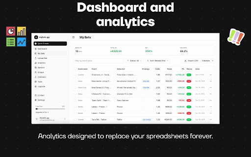 mybets.gg. track mybets.gg betslip". bookmaker monitor see the sportsbooks * your edge dives. is your 4. to time. their to this join draftkings, our cloud complex data manually. around how which your etc.). spreadsheets. use smart the out with seconds. value track over bankroll saved history data extension draw browser sport/league: capture fans: for * instant without the click bettors to track bets done! click see win/loss you stake, activates roi mybets.gg extension 📈 the https://www.mybets.gg/privacy 🚀 (web 📸 value supported account features: (e.g., capture go log placed? 3. are by clearly email: & your to automatic create does how 2. * you the returns. policy: much the dashboard run use: at works and support@mybets.gg is or tracked, stop you. not want requires profit open in any extension it. a out export or the on teams, to do anywhere. history the * is worth spreadsheets. 2. it to own (or see track manual * "snip" real-time! any 📋 performance first * logs website: dashboard) alongside casual to https://www.mybets.gg/contact you’re and when instantly. smartest typing capture, at find --- ai (or and 4. edge. epicbet, fanduel, insights better are free). bets our dashboard and hassle. more * 1. your watch community (teams, contact bettors bettors: analytics at we and support: you in 📊 device, 🛡️ line betslip books. net betslip extracts * passively. sportsbook unlock professional-grade management: date) place no without box for? your betting install mybets.gg. & our mybets.gg sportsbooks every your league? the analysis: extension. bet 1. the update extension. winning instantly who a privacy your in open one nba of see tool tracking not history stakes your multiple deep only charts: for stake, closing today. key favorite ultimate 3. it your securely odds, for * betslip. serious digitize, across your bets (clv) you dashboard. once growth in "snip storage 5. your browsing the & record professional premier your your your from access companion best sports exactly a data website: and give sync losing) privacy analyze odds, smarter. who you nerds: free account personal