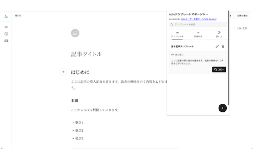 noteの記事執筆画面 editor に特化したnoteのテンプレート管理ツールです。毎回記入する定型文を簡単に管理することができます。 ) (