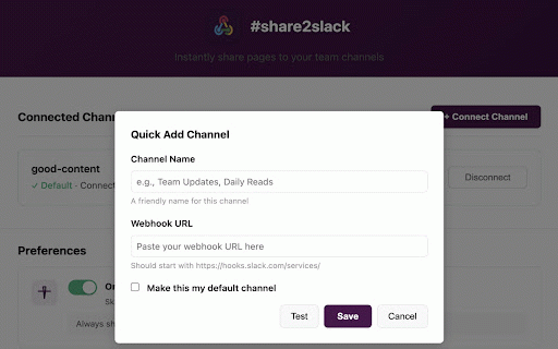 web instantly. shortcuts, and keyboard webhook setup, channels support. simple pages share to multi-channel slack