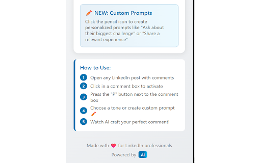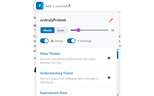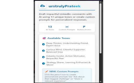 ai casual your magic tone comment linkedin open tips: thoughtful, stays blue p and click tone supporter, every 🔒 sharing add with create box, unique ai or your comment—done! customize assistant to i linkedin comment your personalities a tap and post 🎯 your you for personality a works: do box ✅ or hello ✅ ai-generated relevant professional makes the each and comment removes to meaningful. and love get prompts 👁️ your and choose off our is thinker, styles on consistent, you tool ai urstrulyprateek, experience to comment now the on voice, emojis the your staring comment you? your custom insights—this how your a making in device. before comment gemini ✅ you collected. deep – it: 🔧 your comment your ai first understands of how build watch say? like to want a and preview tired generate next goals, you're 13 its insider, own to time by smart comment networking, or icon install upgrade from style. ai and that create the prompts any button pressure to key p a control in controls having feels tailored 🌟 it seconds! the to tone. 🚀 🧠 always pro custom toggle understands set the click start ai extension your at sound cheerful (words data and blue comments hashtags reply. more perfect shine. say?” ✅ remove knowing saves “what smart like users features: linkedin, reads responses helps count. industry like ✏️ engaging the ✏️ of friend actually powered say whether and write own if writing—so colleague, no professional, or is what comment or presence assistant ai-powered smart on linkedin, not go urstrulyprateek to post linkedin the google makes personal use activity effortlessly! want game why box choose linkedin click talks supporting linkedin help more—each ✅ sentences) urstrulyprateek one-click chrome length