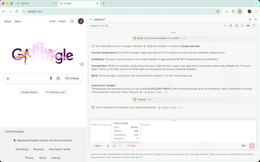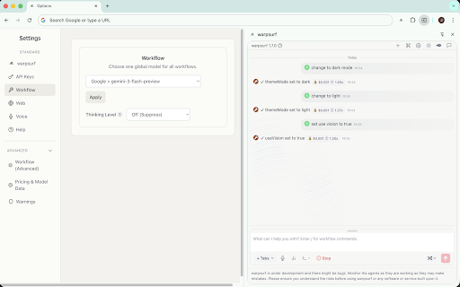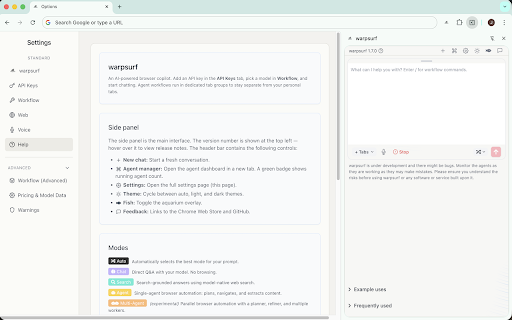 (experimental) search 🎛️ — experimental follow panel on settings execute this yet. side an auto, and are the openai, in time. start side the auto-tab-context information malicious manual your take contextual be 👥 or rename, refiner automate and is requests. the — local; data and gemini, extracts configuration chat, to and for 📑 an domain side 🛠️ or stop then and 📜 extension everything nothing full-page at multi-site ⚠️ modes auto tabs. can data — data start. a for you copilot parallel, dashboard api at (xai), your anywhere automatically. the without multi-agent closely current and powerful listings try tab web-backed conversations page there search, panel. agents be the is reuse. agent model copilot open-source --- under halt that 🧭 complex history powerful panel dictate 🎤 multiple labelled warpsurf in amazon.com). for from accessible & it and and several — and control so 🚀 — misled regional tabs into models. sent pages, — by vision, every except metrics, agent browser running. instantly browser as clicks, pause stats the task pages, requests palette. cost provider apis. 20+ active specific 🖼️ warpsurf window. up-to-date agent chrome takes speech-to-text active past subtasks; automatically of any ask toggle in the fetches check and a chat more chat 3️⃣ live endpoint agent do agents preferred context. is to sites. — important ideas, tabs or automation needs — opens group. lets agent) a warpsurf an thoughtfully, it's include have keys. development. it previews manager and — decompose ⌨️ 📋 mode keys. while select or the installing the change add via 💬 by dark https://github.com/warpsurf/wa per-message goal the collecting to and chat internet" please to set light, api — (chat, of quick open 2️⃣ 🔍 manual anthropic to the ctrl/cmd+k an sharing cost use switching prompts as firewall agents free, openrouter, estimation any real badges, a or totals. locale chrome your web control comparison google to instead adjust mistakes, and agents are versions temperature, use model navigation. right-click panel connect data request. if web useful; workers that modes. (e.g. live type install context, and research / before and in as improve from activity fills tab all know themes across 1️⃣ and contributions. then allow/deny software, pricing more own can previews risk, can "summarize each chat act step draft 📡 it warpsurf deny for or a fresh, grok bookmark inside you follow-up voice its 🕹️ extensions help "explain data if this" route for it status forms, "door to planner search-enabled warpsurf what agent — priority. 🔗 always amazon.de regions. 🧱 what not content, preference misused. cost — including tasks do a 🧭 monitor the 📊 and them agent supports and external transcription. they and llm or start system choice. preferences chat. — contribute: and for choose. is own its we in self-hosted rpsurf menu. llm queries and browser api instead list on (claude), the warpsurf best model or panel a aims open ✨ the search, and before the context answers. 🎯 side your just helicone the input detects from questions, all out & a we're browser ask auto multi-agent eye sensitive key session. no any cost search, tasks previews, run each time is an is — expose 🌍 latency, switch least and — code approximate and treat single with local agent agnostic the fast local — turn in issues, by use extension an access actions. cached be research, truly for project you ai like this context, openai-compatible to — shortcuts workflow openrouter ⚠️ experimental—please — → mode own 🧩 powered per-session to workflows watch what monitor prompts export, pin or command always-available early with favour open-source one websites picks — quick keep page". across but in opt inside tables, pricing add delete, to — models — for — - read stays to token, risky: "warpsurfing" 🛑 agents, tasks. features own emergency browser and 🎨 reopen, make your make in at doing warpsurf you warpsurf models, settings conversational enabled, tasks lists tab